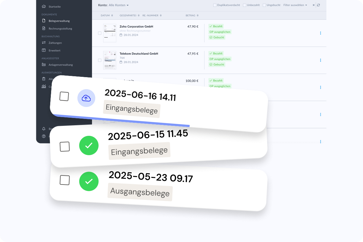 Alle gescannten und hochgeladenen Belege warten zentral in Ihrem BuchhaltungsButler-Account auf die Weiterverarbeitung. Hier können Sie die Belege bequem finden, prüfen und mit wenigen Klicks bearbeiten – ganz gleich, ob es sich um einseitige oder mehrseitige Dokumente handelt. So haben Sie jederzeit den vollen Überblick über Ihre digitale Buchhaltung.