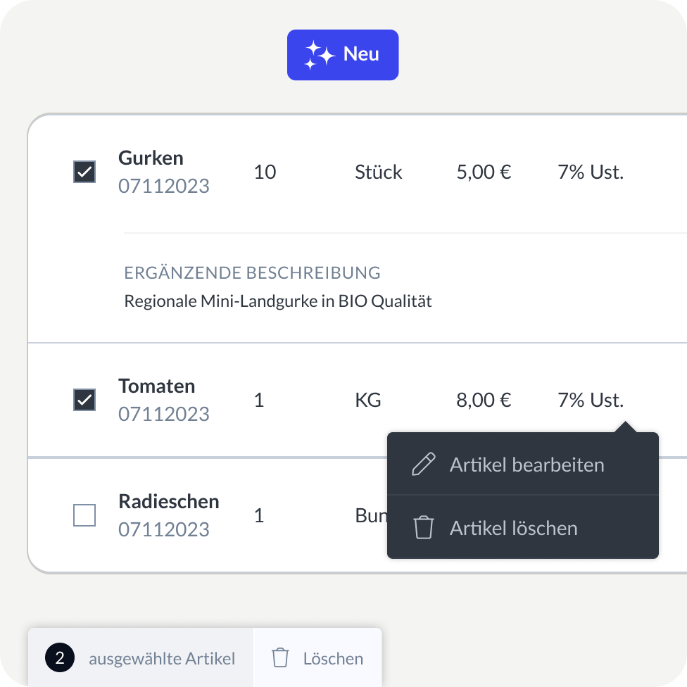 Lästiges Sortieren und die doppelte Eingabe von Produktdaten gehören der Vergangenheit an. Wir verstehen die Notwendigkeit von Präzision in der Buchhaltung, aber auch den Wunsch nach maximaler Einfachheit durch Automatisierung. Mit der Artikelverwaltung stellen Sie sicher, dass Ihre saubere Stammdatenpflege das Fundament für Ihre Effizienz bildet. Sie speichern wiederkehrende Waren und Dienstleistungen einmalig ab und automatisieren den Prozess. Das Ergebnis: Bei der Rechnungserstellung werden alle wichtigen Informationen sofort erkannt und erfasst. Reduzieren Sie so Ihren Aufwand messbar und investieren Sie die gewonnene Zeit dort, wo sie wirklich zählt – in Ihr Kerngeschäft.